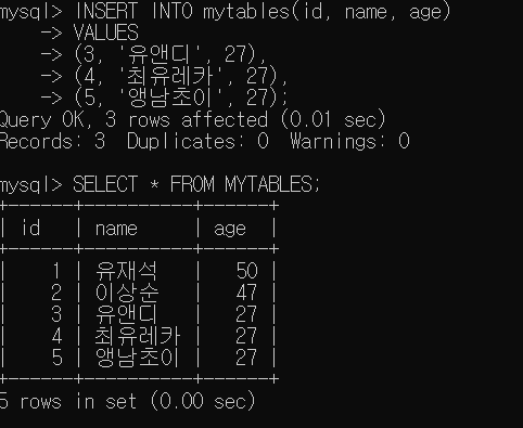 저는 mytables라는 테이블을 생성해주고 해당 테이블안에 insert into table name 문법으로 데이터를 추가해 보았습니다.