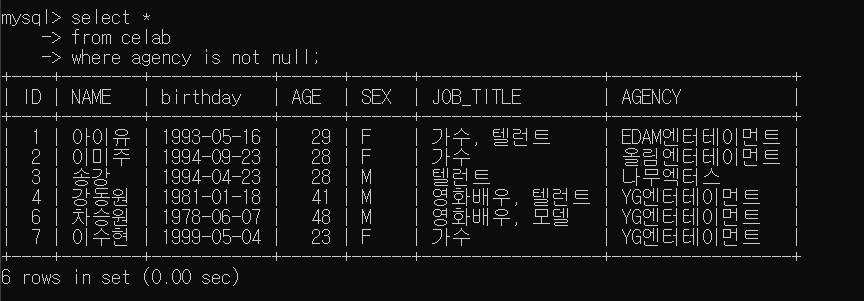 agency컬럼에 null값을 가지고 있는 데이터를 반환 합니다.